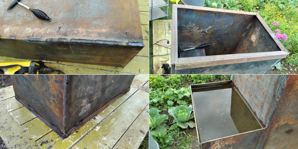 Провариваем все швы. По низу привариваем уголок для усиления конструкции, предотвращения деформации и прогорания металла в районе топки. Заполняем бак водой и проверяем его на герметичность. В бак желательно врезать кран для слива.