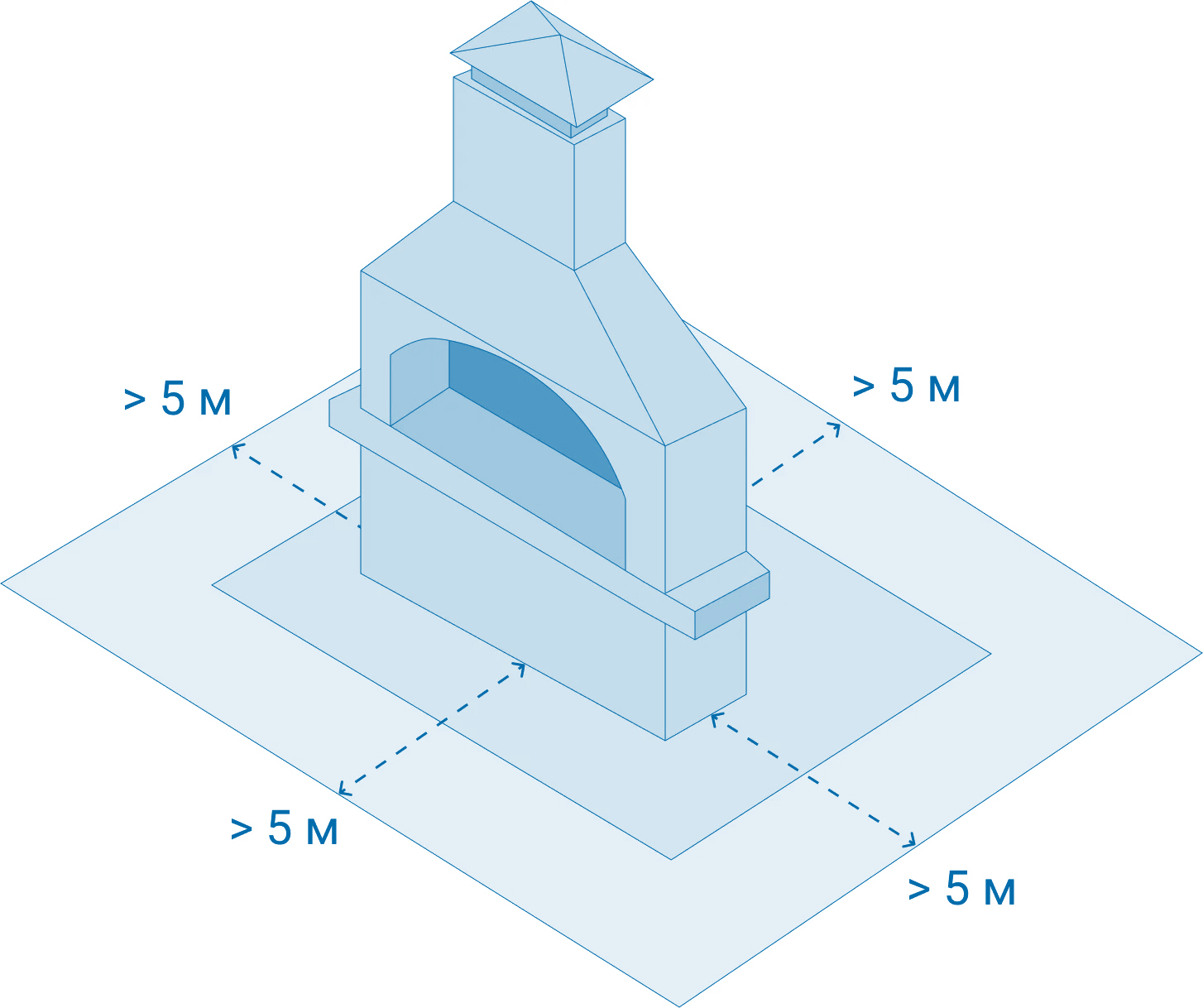 - расстояние от огня до дома, забора и любых других построек должно быть не меньше 5 м