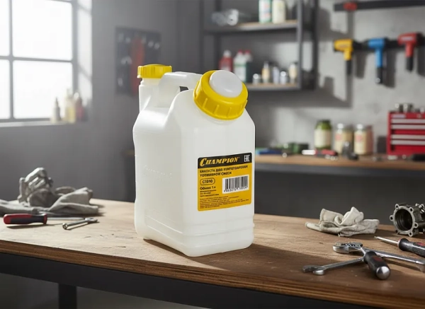 Перед тем как приготовить топливную смесь для бензопилы чемпион, нужно подготовить чистую бензостойкую емкость. Топливный бак для этого не подходит, так как в нем невозможно довести рабочий раствор до однородного состояния, в том числе, без снижения его качества.